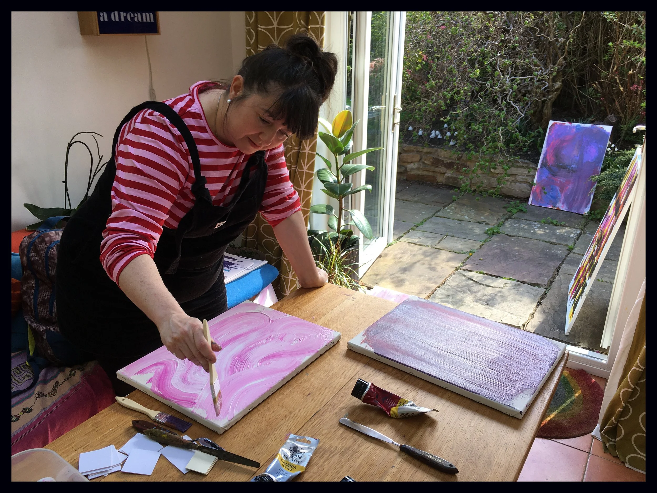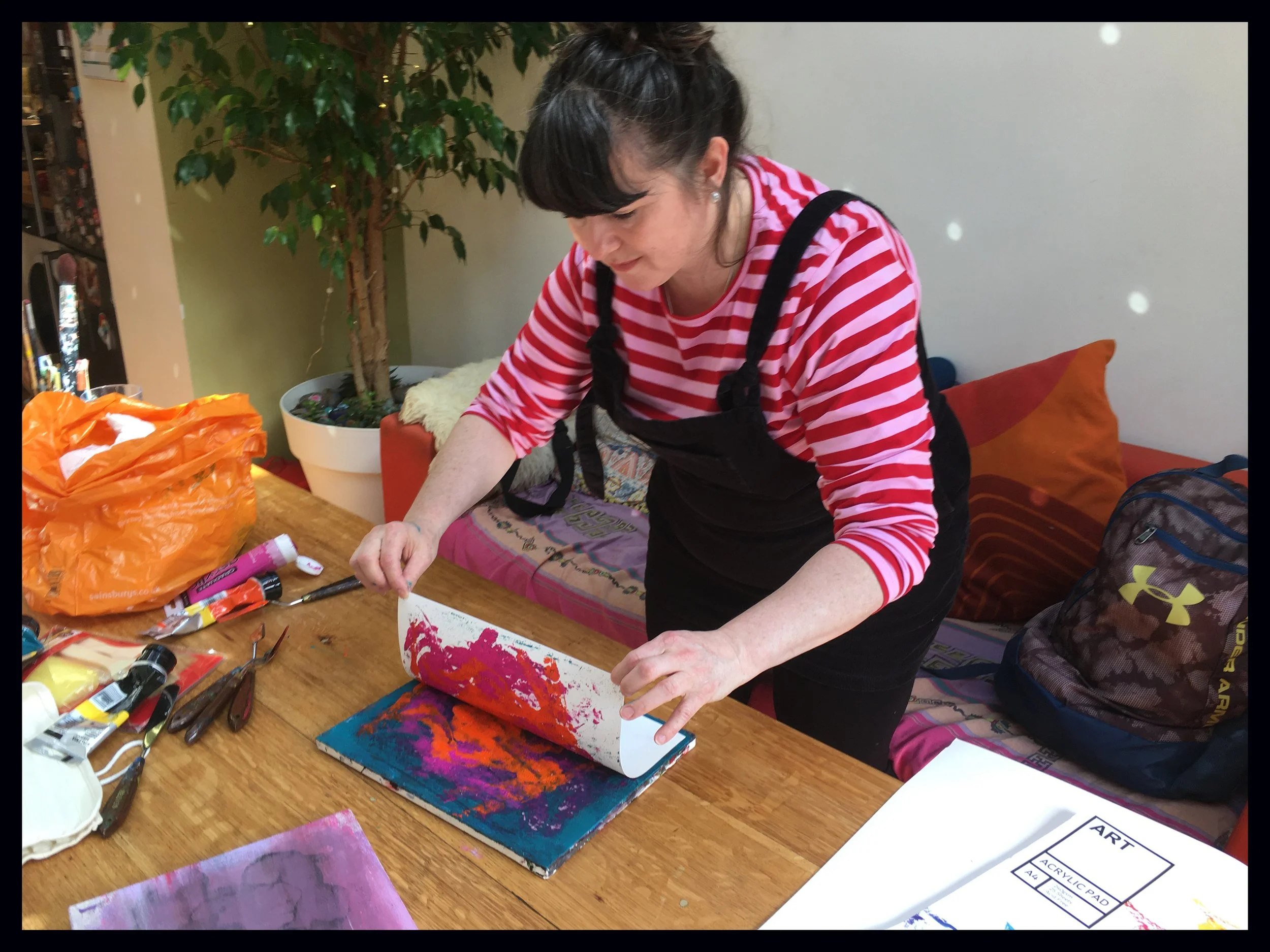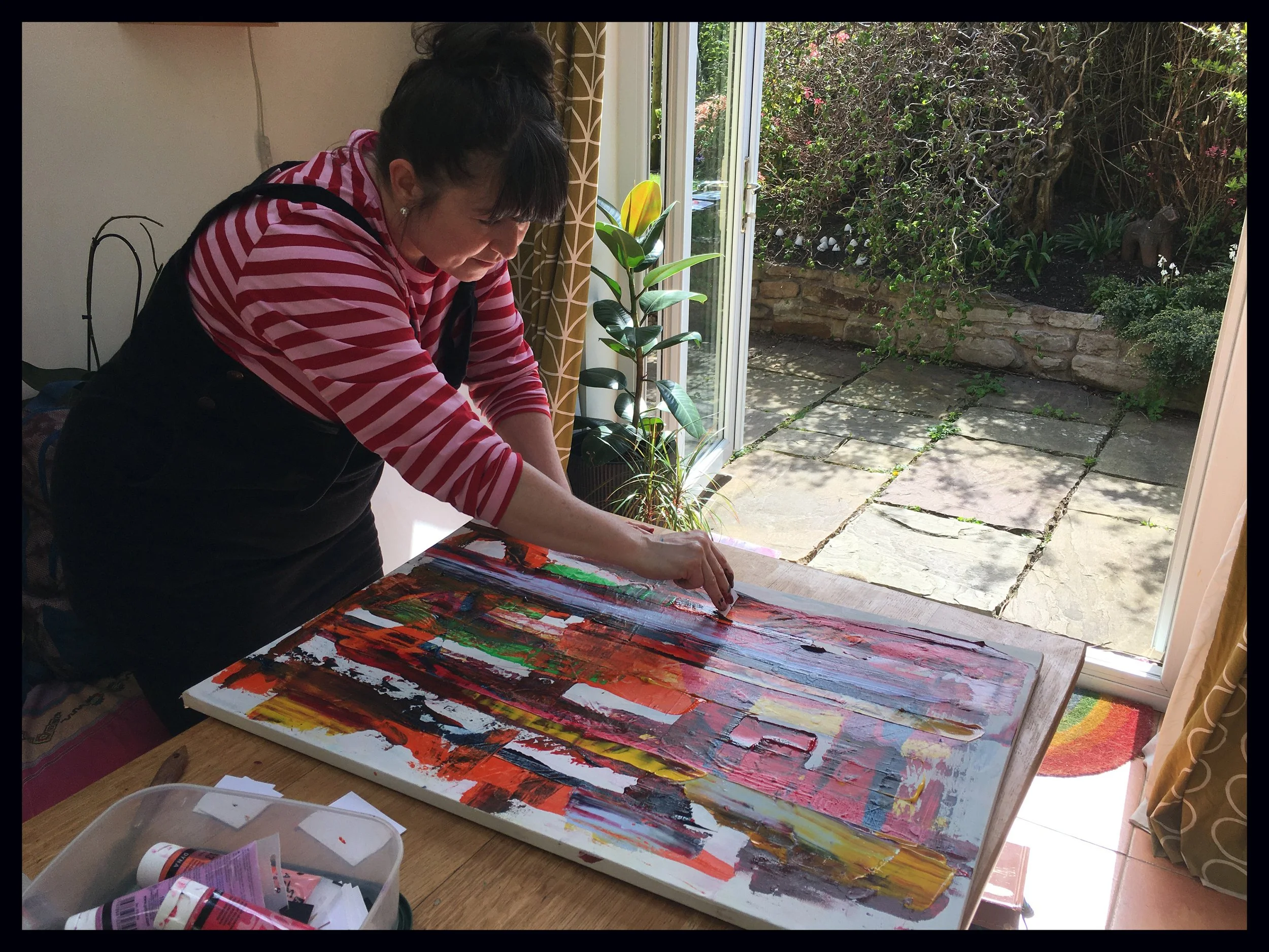 With pallet knives, brushes, mount board squares & our hands. Painting with your hands is a liberating experience & let the movements flow as they wish.